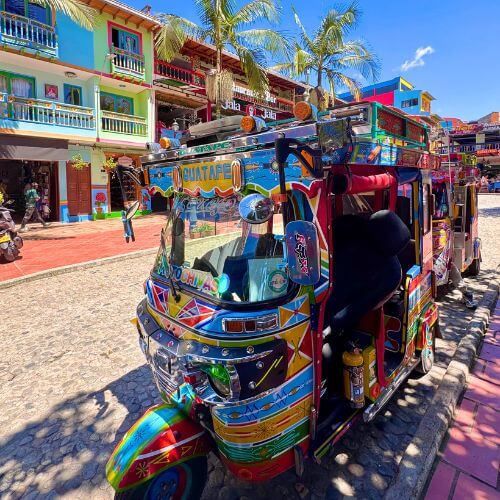 Terminata la visita ci sposteremo nel cuore della piccola cittadina per il pranzo. E quando pensavamo di aver visto il massimo dei colori a Filandia…ecco che arriva il centro storico di Guatapé! Non solo tutti gli edifici sono colorati, ma le facciate delle case sono a loro volta decorate con i famosi zócalos, bassorilievi dipinti che raccontano mestieri, animali e scene di vita quotidiana. Una vera e propria tavolozza di colori a cielo aperto!