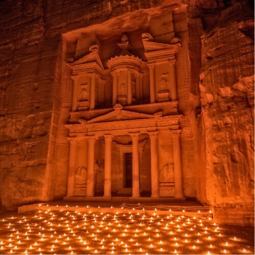 La sera parteciperemo a Petra by Night: il Tesoro illuminato da migliaia di candele, il silenzio del deserto e il canto che riecheggia tra le rocce. Un’esperienza che chiuderà la giornata nel modo più potente possibile!